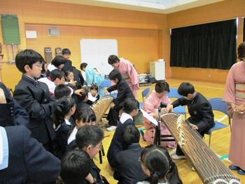 事前の学習で少しは和楽器や邦楽について学んでいたものの、生の演奏で聴くのは初めてという児童が多く、どんな響きや音色なのか、どのように演奏するのかに大いに興味を持ったようでした。