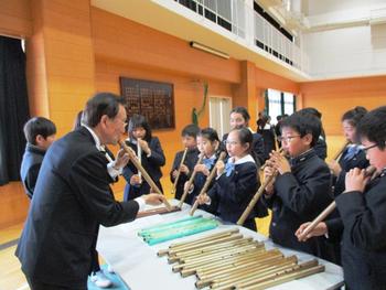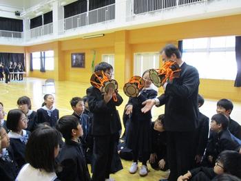 演奏披露の後は、M1生たちに楽器の演奏を体験させていただきました。箏を体験させてもらった児童たちは、恐る恐るながらも、上手に「さくら」を奏でていました。一方、尺八の体験では、練習用のプラスティックでできた尺八を鳴らすのに一苦労。力を入れれば入れるほど、顔が真っ赤になり、息がどんどんこぼれていきます。中には、うまく力を抜いて、きれいな音を響かせる者もいました。また、鼓の体験では、持ち方や手のひらの当て方に苦労している者が多かったようです。実際に触れてその難しさや良さを知ることが大切だということを彼らは学んでくれたと思います。