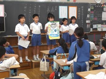 この日、P3生たちは班ごとに小学校のすべての教室を訪問し、「①歯磨きの時、コップに水を汲もう(これだけでペットボトル3本分の節水)、②手洗いの時、流しっぱなしにせず、水を止める(これだけでペットボトル5本分の節水)という取り組みを18日(月)~22日(金)までの5日間実施しますので、みなさん協力をお願いします」と呼びかけました。もちろん私のところに来た児童たちも、自分たちで調べた水の大切さについて話をしてくれた上で、この活動について協力してくださいと呼びかけてくれました。私からは、「大事なテーマに取り組んでくれてありがとう。災害の時などは特に水の大切さを感じます。ふだんから水を大切にするという気持ちを持つことで、地球全体のことを考えられる人になれると思います。頑張ってください」と言葉をかけて、協力を約束しました。
