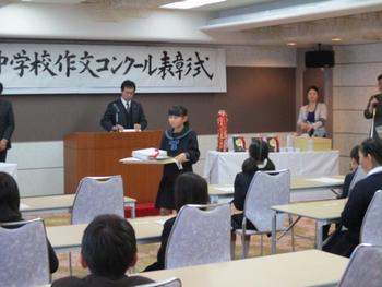 この後、受賞者代表の作文朗読があり、最初に細川さんが自分の作品を朗読しました。細川さんの語る「パーポーパーポー」という救急車のサイレンの音は、時におばあちゃんの助けを求めている声であったり、自分たちを不安にする音であったり、皆に協力を呼びかける気持ちであったりするように、私にも聞こえました。また、出来事の一部始終を、丁寧に、しかも長い文章で綴っていることに改めて驚かされました。