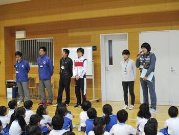 登場したのは6名の先生方。P2(小2)のMi先生とP3(小3)のI先生は10kmの部に、P1(小1)のWa先生、P2のI先生、P3のYa先生、P4(小4)のFu先生はフルマラソンの部に出場しました。一人ひとりから昨日の感想を述べてもらいました。