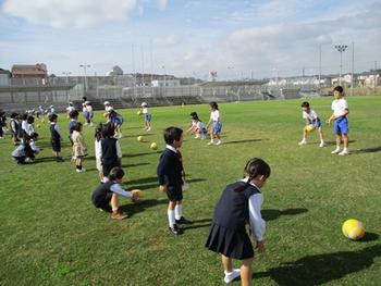 説明会終了後、子どもたちは2つの教室に分かれて、国語の授業を体験しました。保護者の方にも、その様子をご覧いただきました。授業のタイトルは「へびが『へ』になった!」。ひらがなを学ぶ授業なのですが、黄色紙粘土をヘビのように長く伸ばして、ひらがなの「へ」という字を画用紙の上に作ります。この時、どの辺りで折り曲げるかがポイントです。そこに目と赤い舌をつけて「『へ』の字のヘビ」が完成です。P3・4生の、お手伝いのお兄さんやお姉さんの助けを得て、皆上手に完成させていました。国語の後は、総合グラウンドで体育の授業体験です。ここでもお手伝いのP3・4生が年少児や年中児たちをうまく誘導してくれ、楽しくボール遊びに取り組んでもらいました。