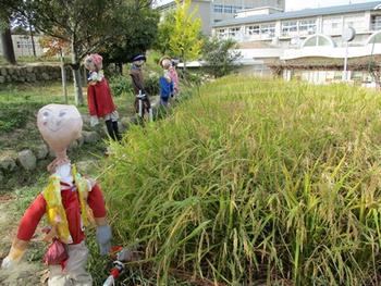 11月4日(水)、P4生(小4)たちが「稲刈り」を行いました。5月9日(土)に「もみまき」をした”ひのひかり”と”あさひもち”は順調に育って、棚田いっぱいにたわわに実っています。P4生たちが作ったカカシもみんな笑顔です。天気も上々、季節的には少し遅いのかもしれませんが、絶好の稲刈り日和です。