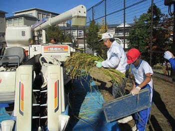 慣れてくるとペースも早まります。刈り取った稲は、Pグラウンドに設置されたコンバインで脱穀します。稲を刈る者、運ぶ者など分担が出来てきたようで、どんどん作業が進みます。棚田は、幼稚園の園庭の上にあるので、園庭で遊ぶ幼稚園児たちも、お兄ちゃんお姉ちゃんたちのテキパキとした動きを不思議そうに楽しそうに見つめています。