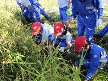 軍手に長靴姿のP4生たちが棚田に降りてきて、指導をしてくださっている「ならグリーンファーム」の飯田さんから説明を受けます。最も気をつけなければならないのは鎌の扱い方。「右手で束をしっかり持って、鎌を丁寧に扱うこと。勢いをつけて振り回してはダメですよ」と注意が飛びます。児童たちも恐る恐るの姿勢で刈り取り始めます。順番を待ちきれなくて鎌に近づこうとする者には、飯田さんからお叱りの声が…。