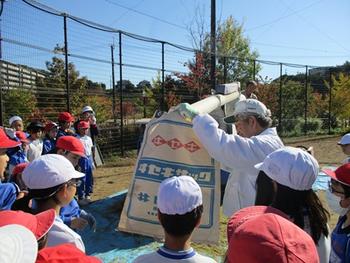 さて、最後は脱穀された籾の袋詰めです。大きな田んぼではコンバインで一連の作業としてするのでしょうが、ここではコンバインのタンク内にたまった籾を長いアーム状の筒から手に持った袋に吐き出させます。あっという間のことで、周りを取り囲んでいた児童たちも袋の中にどんなものが入ったのかに興味津々、頭を寄せ合って中の籾を見ていました。「あれだけ刈り取ったのに意外と少ないな」の声も聞かれましたが、そういう時こそ、出荷するために大量のコメを生産する農家の方々の労力と苦労に思いを馳せてほしいなと私は思ってしまいました。