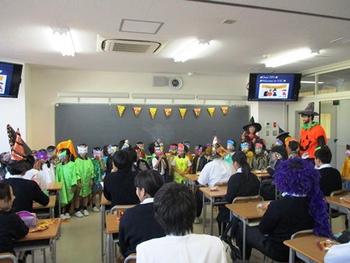 2限目、PP棟から年長児たちが色鮮やかな衣装に身を包み、仮面までつけて悪魔や魔女になりきっての登場。Y棟3階のY3C(高2)の英語の授業に乗り込んでいく。Y3生たちも楽しみにしていたようで、準備よくハロウィン用の飾りを身につけて園児たちを迎えた。日頃の授業の時とは違って、皆にこやかな顔である。園児たちが歌う「ハローソング」や「ハロウィンソング」に何やら癒された表情の者もいる。一方の園児たちから見れば、「この大きなお兄さんやお姉さんたちはこんなところでいったい何をしているのだろう?」と不思議な気持ちになった者もいたのではないかと思う。