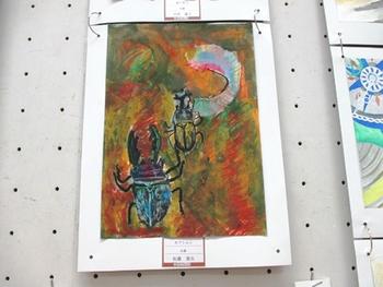 個々に見ると、大田君の「サタンオオカブト」の迫力が印象に残りました。画面いっぱいに描かれたサタンオオカブトが、上下にあるその鋭い角で何かを挟んでいるようです。背中のつやや上角の輝きの描き方がとても上手だと思いました。佐藤君の「カブトムシ」は、全体の色調に感心しました。虫たちの世界観のようなものを感じさせる作品で、太く黒く描かれた虫の存在がピタッと決まっていると感じました。