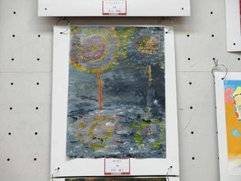 井上君の「さっぽろゆきまつり」は、雪景色の白い世界にうまく他の色を取り入れているところが良いと思いました。木々や建物、そして人物を上手く見たまま感じたままに配置し、描き分けています。平沢さんの「夜の花火」は、打ちあがった花火と、それが水面に映っている様子が描かれています。真っ暗ではなく、花火が輝いた時の淡い夜の景色の描き方も素敵だと思いました。
