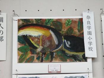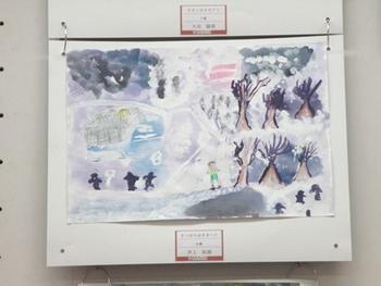 本校から個人の部で入選したのは、P1(小1)井上君の「さっぽろゆきまつり」、P2(小2)大田君の「サタンオオカブト」、P3B(小3)平沢さんの「夜の花火」、P3佐藤君の「カブトムシ」の4作品です。まずはこれらの作品をじっくりと鑑賞しました。同じ壁面にある他校の作品と比べると、この4人の作品は渋い色遣いで、物語性のある場面を描いているように感じました。児童たちが自分の中で物語を展開させながらこのような絵を描いたのではないかと推測して、嬉しい気持ちになりました。