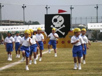 P1のダンスは名づけて「海賊きっず♪」。先生方によって組み立てられたドクロのマークがついた帆船から、バンダナを締め、海賊剣を持って子どもたちが飛び出してきます。可愛らしくて、決して怖そうではないのですが、子どもたち自身はもはや海賊になりきっています。なかなか息も揃っていて見事なダンスです。2クラスと少ない人数のP1生たちなのですが、フィールドいっぱいに広がって踊る姿、みんなで決めのポーズを作る姿など、しっかりと存在感を示してくれました。