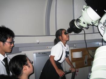 今年は秋が早いのか、屋上に上るとかなり肌寒く感じましたが、狭いドーム内は児童たちの期待と興奮で温かく感じられました。まずは西の空の月齢5.1の三日月を観察。肉眼では光った部分だけしか見られないのに、望遠鏡を通して見ると、影になった部分もよく見えます。また、たくさんのクレーターも見ることができ、一人ひとりが大きな歓声をあげていました。そして次は、今、月に接近している土星の観察です。私も見せてもらいましたが、輪(環)を持った土星がはっきりと見ることができ、とても感動しました。理科のF先生から、土星の、輪(環)についての説明も受けました。