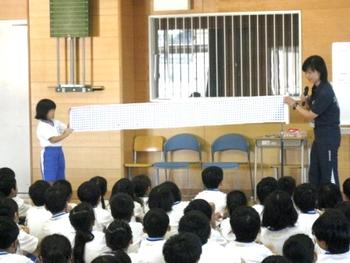 P2(小2)B組では、クラス全員がそろっている時、みんなが時間を作り出した時に1000までの数字を数えているそうです。1学期に1000までの数を学習したのを機に、6月からみんなで取り組み始めたそうです。一人が一つずつの数字を言い、クラス全員が言い終えると一周です。簡単のように思えますが、全員で時間を作って、という条件はなかなか難しいようで、現在329まで数えたところだそうです。このことから、N先生は児童たちに、「2学期はいろいろな行事があって忙しい時期です。そんな中でもやろうと決めたことについてはそのための”時間を作り出す”ことが大切です。一人ひとりがそれを意識し、考え、協力することによって”時間を作り出す”ことができます。そうすれば、やろうと決めたことのためにたくさんの時間をかけることができます。」と伝えました。