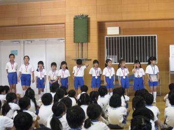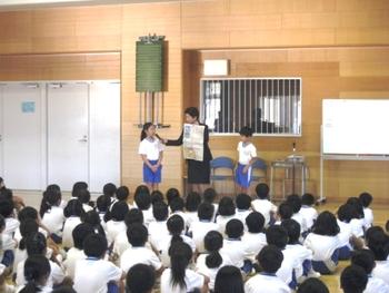 続いてN先生から、全国書写書道教育振興会主催の「第27回全国ひらがな・かきかたコンクール」で受賞した児童の発表がありました。ダイヤモンド賞を受賞したP2阿品さんをはじめ、金賞受賞のP1(小1)の板倉さん、奥さん、P2の大島さん、横井さん、粟田君、廣田さん、P3の渡邉さん、飯田さん、P4の松本さん、畑谷さんに私から賞状とメダルを贈りました。