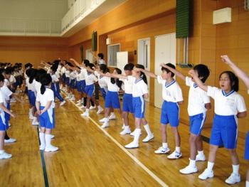 この日の最後は、P3(小3)担任のY先生から、プライマリースポーツフェスタに向けての応援団の紹介と、応援歌の披露です。赤組・白組それぞれの応援団が登場し、「ゴーゴーゴー 運動会の歌」をみんなの前で歌ってくれました。各組全員での熱唱を期待しています。