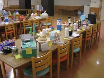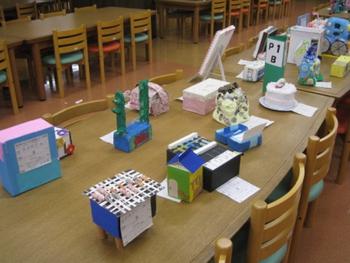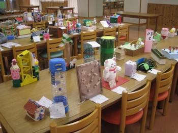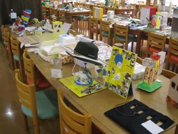 P4(小4)では発明工夫の作品が中心。興味を持ったのは使われている材料です。ペットボトルやアルミ缶、牛乳パックのほかにも、木材や和紙を使ったもの、太陽光パネルやモーターを使ったものがありました。さすがに4年生。また、「明日の持ち物ランドセル」、「勉強整理らくらくBOX」、「朝のおいそぎセット」など整理整頓のための工夫や、「くずれま洗濯物」や「たかーいところをゴシゴシスティック」などお手伝いの時に考えたアイデアを形にした作品もありました。日頃のみんなの苦労が伝わってきました。