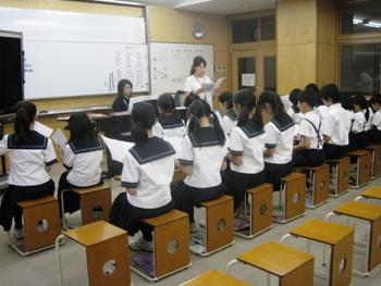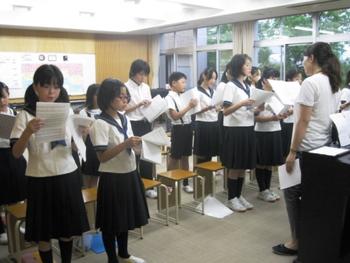 小学校のコーラス部には、現在P4に5名、M1に2名、M2に10名の部員がおり、音楽科のN先生とS先生、P4担任のK先生が指導に当たっています。練習していたのは、「虹色の花」(作詞:白石はるみ、作曲:太田桜子)という曲。練習し始めたばかりのようで、楽譜を追いかけながらの歌い方で、まだまだコーラスとは言えない段階でした。でも、何とも言えないきれいな曲で、3拍子のリズムと伸びやかな2分音符と駆け上がり駆け降りる8分音符の繰り返しが気持ちよく胸にしみ込んでくる曲だと感じました。
