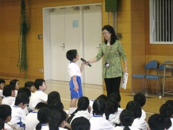 「2学期になり、10月に開催されるプライマリースポーツフェスタの練習が始まります。走る競技ではどうしても速い人、遅い人ができます。でも先生は、ゴールをめざして一生懸命走っている姿を見ると、みんなが一番だと思っています。負けるのはいやかもしれませんが、一人ひとりの一生懸命な姿を先生たちはしっかり見ていますし、応援しています。『だからきらいだ うんどうかい』ではなく、『でも大好きだ うんどうかい』になるように、みんなで力を合わせて頑張ってください。」