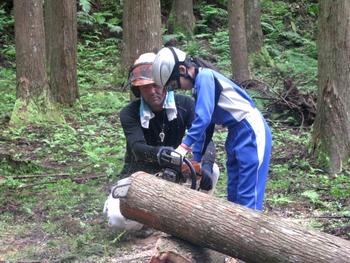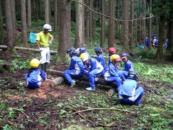 2日目の28日(火)、彼らの様子を見学するために、朝から美山へ車を走らせました。京都縦貫道が繋がりスムーズに行けるようになったと聞いていた通り、園部ICを降りて、山あいのきれいな道を行くと、学校から2時間弱で美山に到着しました。お世話になっている河鹿荘のご主人に挨拶し、この日の体験場所について伺うと、「ここから車で20分ほどですよ」と軽い返事。気楽な気持ちで、その芦生原生林に向かって車を走らせたのですが、道は舗装されているもののどんどん細くなり、山の中へと続いていきます。対向車が来ないことを祈りながらの20分、何とか無事に到着しました。車を出た途端に聞こえてきたのは、森の方からのチェーンソーの大きな音。その音を頼りに森に入ってみると、いました!いました!、ヘルメット姿の我がP4生たち。NPO芦生自然学校の皆さんの指導でチェーンソーやのこぎりを使っての丸太(飯盒炊さんでのテーブルとイスに使うそうです)を切り出しています。勇ましいというよりは、おっかなびっくりの様子ではありましたが、指導員からの言いつけをよく守って、みんな真剣な表情でした。