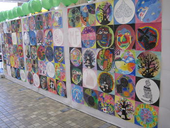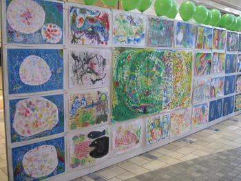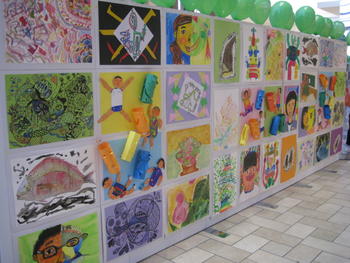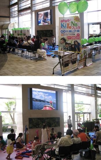 普段の校外・校内で行う説明会や体験授業などと違って、より多くの地域の方に私たちの活動を知っていただきたいという趣旨から、会場には各校の児童たちが描いた図画を展示し、広いスペースにはトイレットペーパーの芯などで作ったカラフルなパイプをたくさん用意し、来場してくれた子どもたち自身の発想で自由に遊んでもらおうというコーナーを設けました。開会からぞくぞくと親子連れが訪れ、各校の図画を見比べたり、先生方と一緒にパイプを積木のように組み立てたり、それに腕をくぐらせてみたりと様々な発想で遊んでくれていました。また、中央のスクリーンでは各校の学校生活の様子がスライド上映され、それぞれの特色ある取り組みや体験活動などの紹介を保護者の方が熱心に見ておられました。