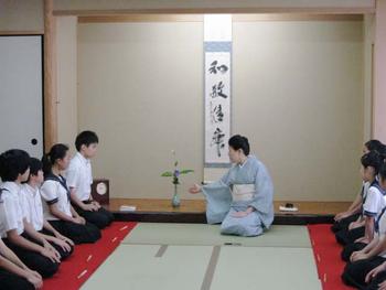 皆が席に着いたところで、赤木先生から、お軸に書かれた「和敬清寂」の意味するところ、床に生けられた花みょうがとききょうについて、ふくさの扱い方についてなどの説明があります。M2生ですから以前にひと通り学んだはずなのですが、ここでも彼らはちょっともたもたした感じ。先生の指導が熱を帯びます。やはり「礼」を身につけるには一朝一夕には行かないようです。授業の中で学んだこうした作法が、彼らの将来の中のどこかで役立ってくれればいい、自国の文化や伝統の良さを知り、いつまでも大切にする心を身につけてほしいと願う気持ちで見学を終えました。