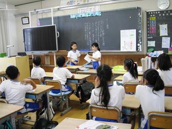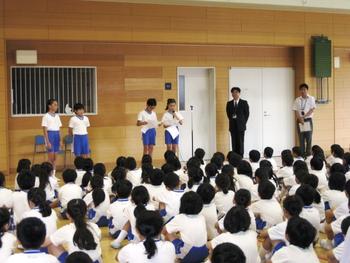 認証を受けたのはP4(小4)から選出された委員長・副委員長・書記2名の計4名。認証式に続いて、委員長・副委員長から前期の活動方針がP生に説明されました。委員長からは、「トイレクリーンキャンペーン」についての説明があり、トイレをきれいに使うこと、トイレのスリッパをきちんと並べること、特にスリッパについては1階と2階でどちらがきれいに並べられているかを競い合うことにします」という提案がありました。認証式の前にあった恒例の”一生懸命”の話で、P3(小3)担任の先生から、「掃除は単に学校をきれいにするためではなく、自分を磨く時間、自分が成長する時間です」と聞いたばかりの児童たちは、「よし!頑張るぞ」と気合いが入ったようです。