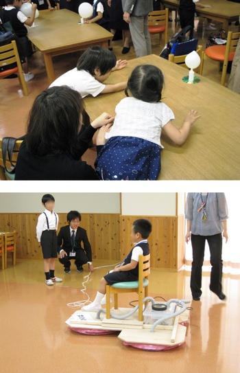 子どもたちみんなが喜んだのは、やはり理科の体験でした。「わくわくサイエンスきょうしつ ~くうきの力~」と名づけたこの体験教室では、まず理科の先生から、風船とフィルムケース、CD盤が渡されます。風船を膨らませている空気を動力にして机の上を滑る卓上ホバークラフトを制作するようです。保護者の方に手伝ってもらいながら制作完了、机の上に置いて軽く押してみると、風船からの空気が少しずつCD盤の下に流れて、卓上ホバークラフトが机の上を滑り始めます。CD盤だけを滑らせてもすぐに止まってしまうのに、下に空気が入るとこんなにもよく滑るということに気づいてくれたかな? 親子一緒に夢中になって遊んでくれました。