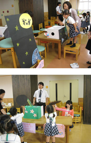 他には、段ボール箱を利用した「空気砲」や「飛び出す宇宙ロケット」、ドライヤーの空気を利用した「踊るヘビちゃん」などがあり、力強く段ボールを叩いて鬼をやっつけたり、宇宙までロケットを飛ばしたり、うちわであおいではヘビちゃんを踊りくねらせたりなど、子どもたちは思う存分楽しんでいました。