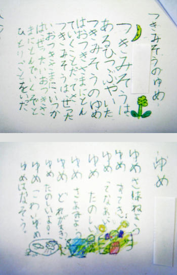 「つきみそうは、あるひつぶやいた。つきみそうのゆめは、おつきさまにとんでいくことだってさ。つきみそうは、ぜったいおつきさまに、いつかは、ぜったいおつきさまにとんでいくぞと、ひとりごとをいった。(下川原君)」