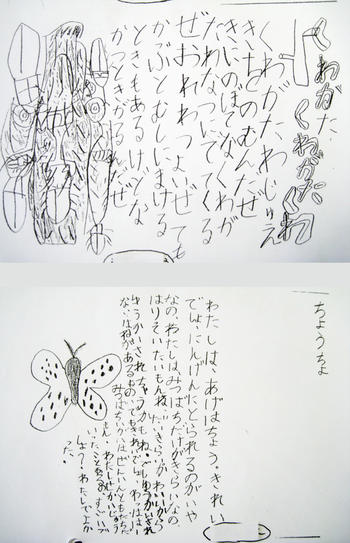 「わたしは、あげはちょう。きれいでしょ。にんげんにとられるのがいやなの。わたしはみつばちだけがきらいなの。はりっていたいもんね、だいきらい。かわいいからゆうかいされちゃうかもね。でもゆうかいされない、はねがあるもの。でもきれいでしょ、わっははー。みつばちいがいはぜんいんともだちだもん。わたしはせかいじゅうにいったことあるの、すごいでしょ? わたしでよかった。(小西さん)」