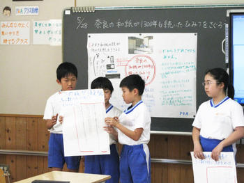 5月28日(木)、P4(小4)社会科の「わたしたちの奈良県~特色ある地域の様子~」という学習で、奈良県吉野町国栖の和紙作りについて学びました。