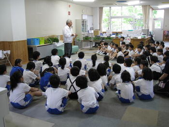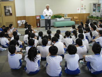 飯田さんはさつまいもの苗を手に、「いのちや食べ物を大切にしてください。自然の恵みでできあがった食べ物は残さずに食べること、決して粗末にしないでください」とおっしゃいました。また、「苗を植えた後の手入れと観察をしっかりしてください。皆さんの愛情によって、秋には良いさつまいもがいっぱい収穫できますよ」と励まされました。児童たちからの「どういう時に水をあげればいいですか?」、「今は根がないのに、苗はどこから水を吸うのですか?」などの質問に対しては、「土が乾いてきたら水をやってください。やりすぎるとくさってしまうことがありますよ。根は水をやると自然と出てきますよ」と飯田さんは丁寧に答えてくれていました。P2生たちが実際に苗を植えるのは週明けの月曜日を予定しています。