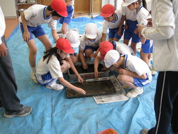 2限目のP4生のもみまきでは、「今日は”ひのひかり”という品種を持ってきました。奈良県北部の”ひのひかり”は4年連続特Aを受賞している品種です。食味(おいしさ)が違うんです。また、”あさひもち”というもち米も持ってきました。皆でおいしいお米を育ててください」と飯田さんからの説明の後、皆は箱に土を引き、その上にもみをまき、さらにその上に優しく土をかぶせるという作業を行いました。我も我もと手を出すので、もみをきれいに分散してまくことや強く押し込まないようにと注意を受けたりしましたが、何とか各クラスのもみまきが終わりました。