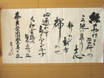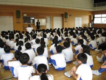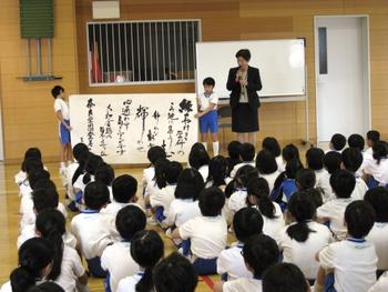 その後、P朝礼のテーマ「一生懸命」のお話になりました。自分が担任をするP4生にあらかじめ頼んでいたようで、彼らが立ち上がって、大きな紙を広げました。なんと、その紙には立派な毛筆で、校歌の一番の歌詞が書かれていました。集まった児童たちだけでなく、周りにいた私たち教員も驚きの声をあげました。先生は、「以前から書道をやってきました。今日のために、昨日の日曜日に”一生懸命”書きました。何枚も書いた中で一番いいなと思ったものを持ってきました。上手かどうかは分かりませんが、とにかく”一生懸命”に書きました。一生懸命にやっていると、楽しくて時間が経つのを忘れる時があります。みんなも自分の好きなことを見つけて、一生懸命に取り組んで、それを続けてください」と説明しました。