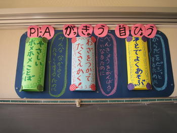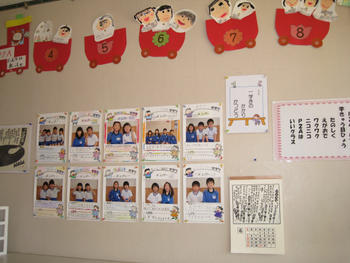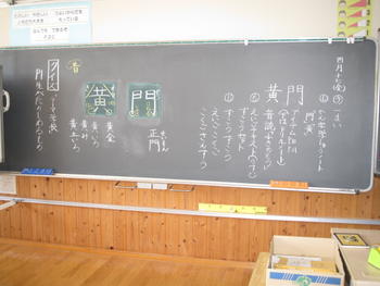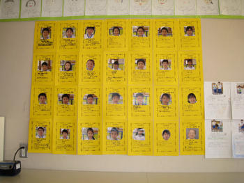 この2週間でついに完成したのでしょう、教室の黒板の上には、「そとでよくあそぶ、わざをつかってたくさんかく!、やさしいホメホメことばをつかう」と学級目標を掲げているクラス。係が決まったのでしょう、写真とともにその役割と意気込みが掲げられているクラス。一人ひとりの自己紹介や目標が後ろの黒板に張り出されているクラス。金曜日に学習した漢字の練習のあとがしっかりと書き残されているクラス。「黄」と「門」が一緒に並んでいるのは思わず笑ってしまいました。