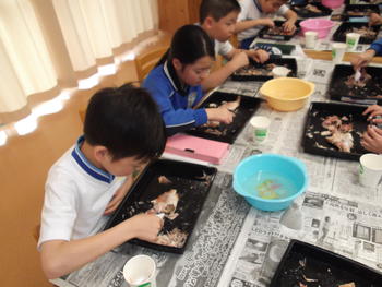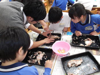 一人1匹のヒダイを解剖していきます。捌きやすいようにあらかじめ電子レンジで火を入れた魚を用いました。私が小学校で経験したフナの解剖とは異なり、かなり解剖しやすくなっています。頭骨にある「大竜」という骨を取り出したり、目玉の部分を観察したりするなど、小学生にとってかなり細かい解剖でしたが、子どもたちは興味津々、丁寧に取り扱っていくことができました。