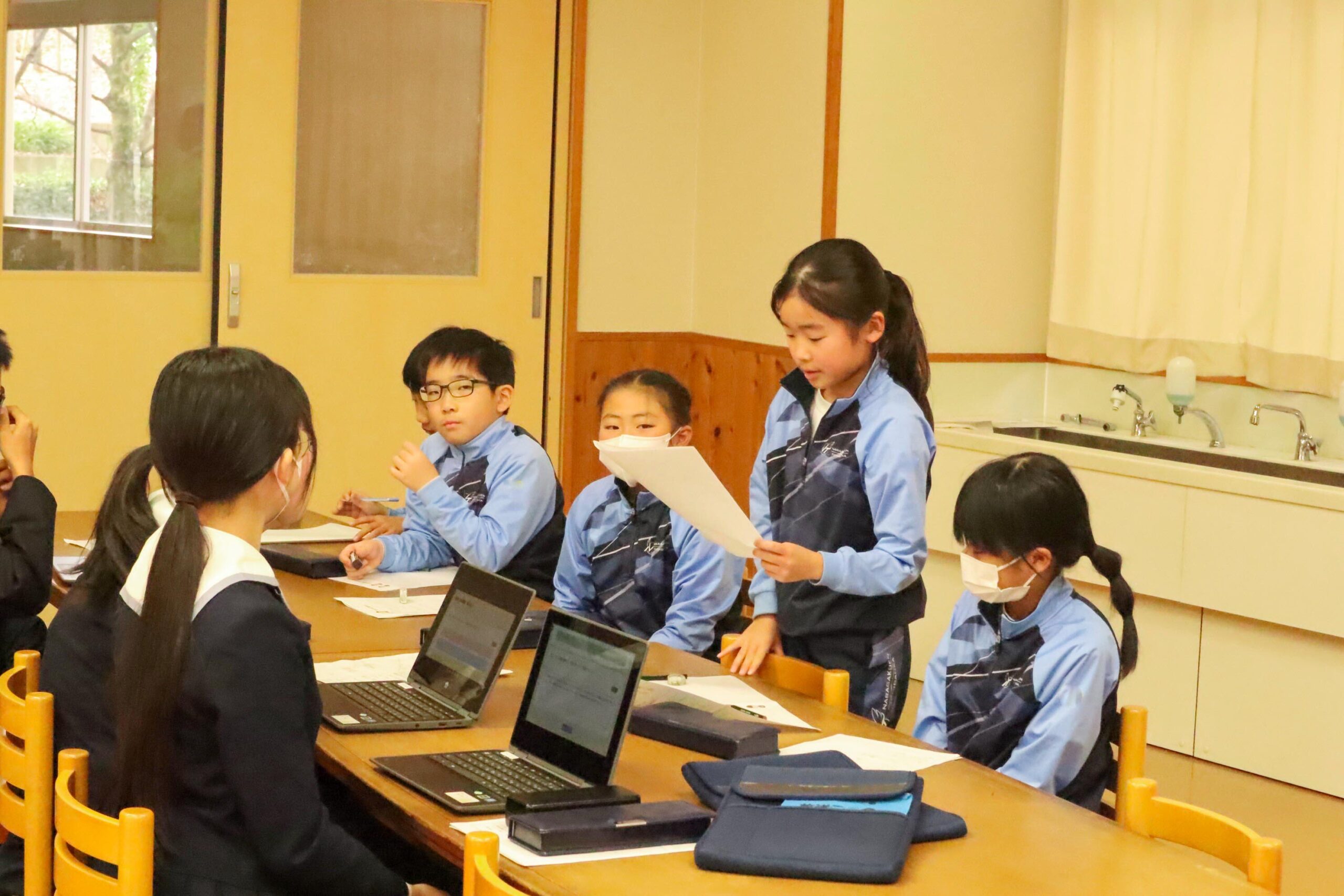 M2生とP3生がそれぞれ4〜5名ずつのグループに分かれ、M2生がこれまで授業の中で学んできた情報モラルの内容を、年下のP3生に「伝える側」となって共有するスタイルで行われました。