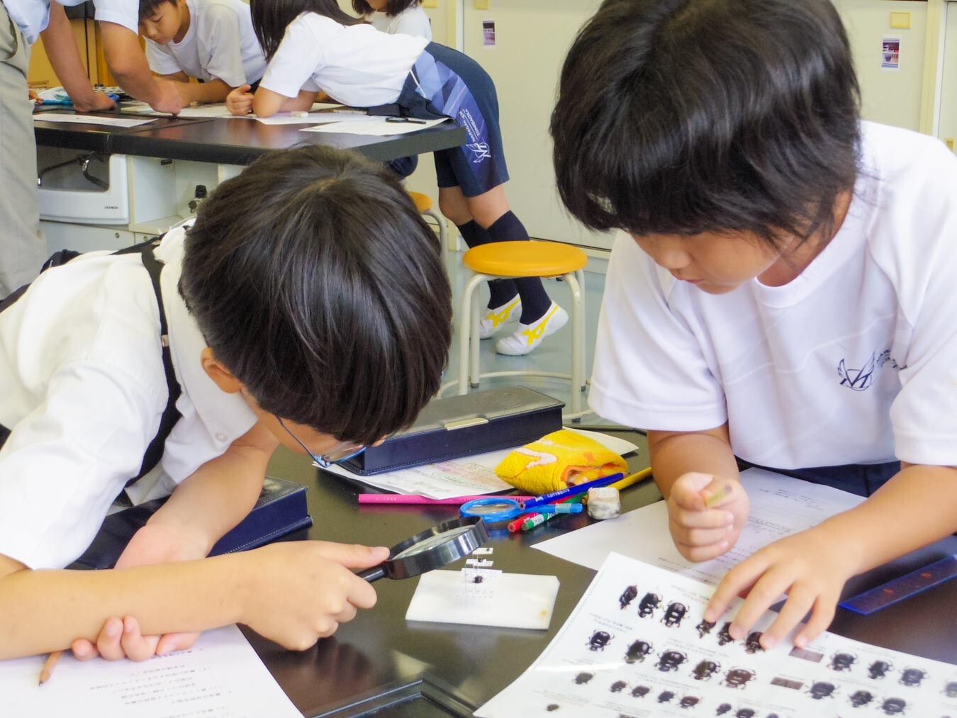 後半はフン中の標本をルーペで観察し、大きさや形、採集場所などから同定に挑戦しました。ルーペを片手に大きさや採集場所、季節、形などを調べました。中村先生に「正解!」と声をかけられると、児童たちは「やったー!」と大喜びでした。