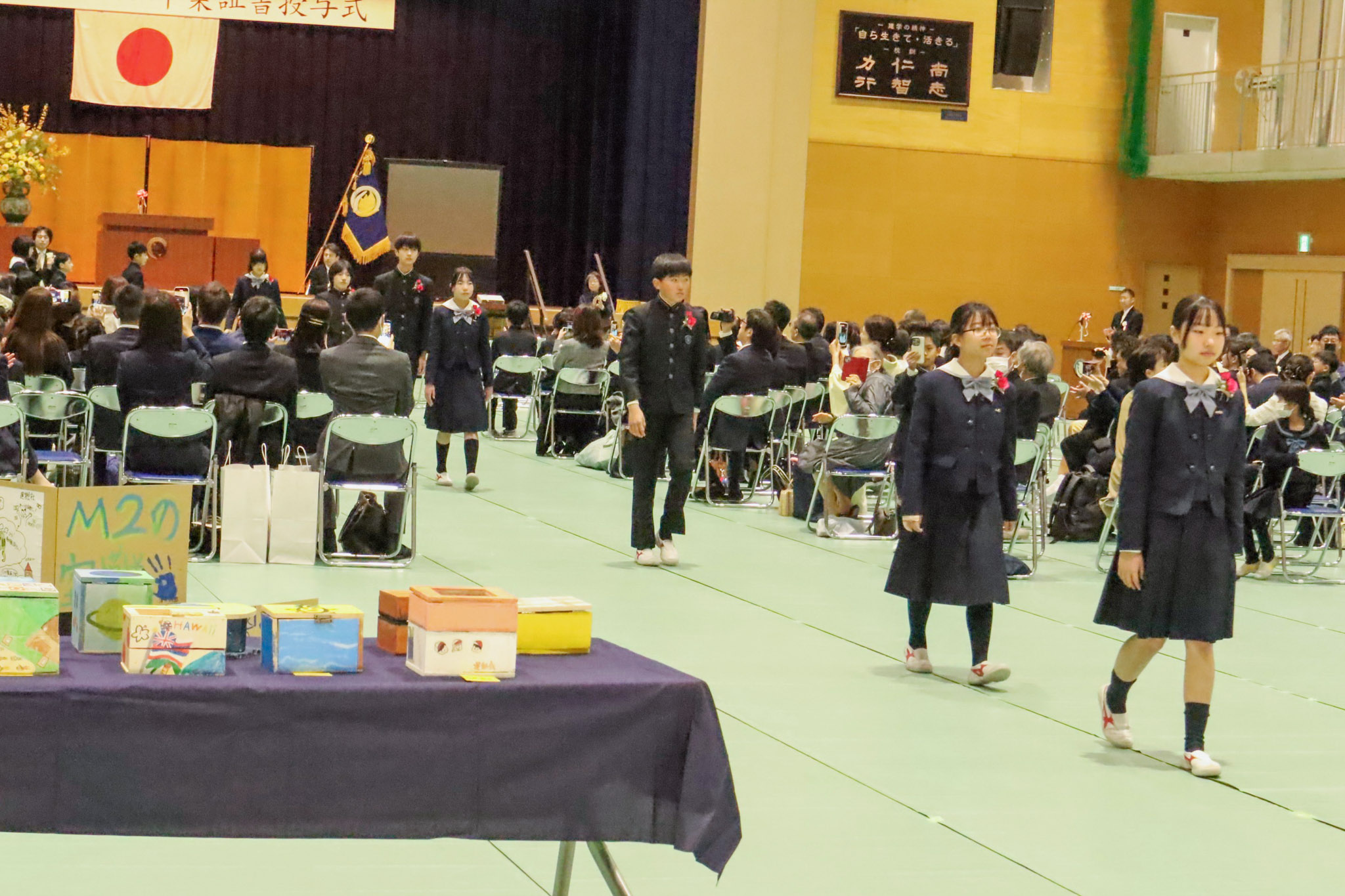 開式の辞、国歌斉唱に続き、担任の先生から卒業生一人ひとりの名前が呼ばれました。高塚校長より「おめでとう」の言葉が添えられ、卒業証書が一人ひとりに手渡されました。