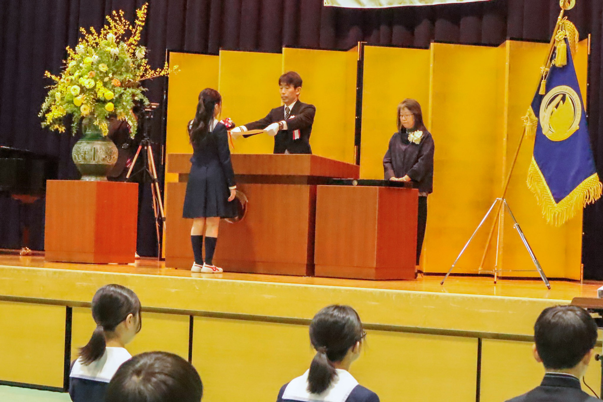 続いて校長式辞では、冬季オリンピックのスノーボード選手・岩渕麗楽さんのエピソードが紹介されました。「競技で滑り降りるわずか13秒のために、長い年月をかけてトレーニングに励み、本を読み、自分自身と向き合い続けてきたそうです。その一瞬のために積み重ねた努力は、何ものにも代えがたいものだったといいます。今回の結果は11位でしたが、やり切ったという清々しさが残ったそうです。皆さんもこれから、受験やさまざまな挑戦の中で、ほんの一瞬のために努力を重ねる場面があるでしょう。その一つひとつの経験が、必ず未来を形づくります。挑戦に満ちたこれからの日々が実り多いものとなり、一人ひとりの夢が実現していくことを願っています」と、卒業生の門出を祝いました。