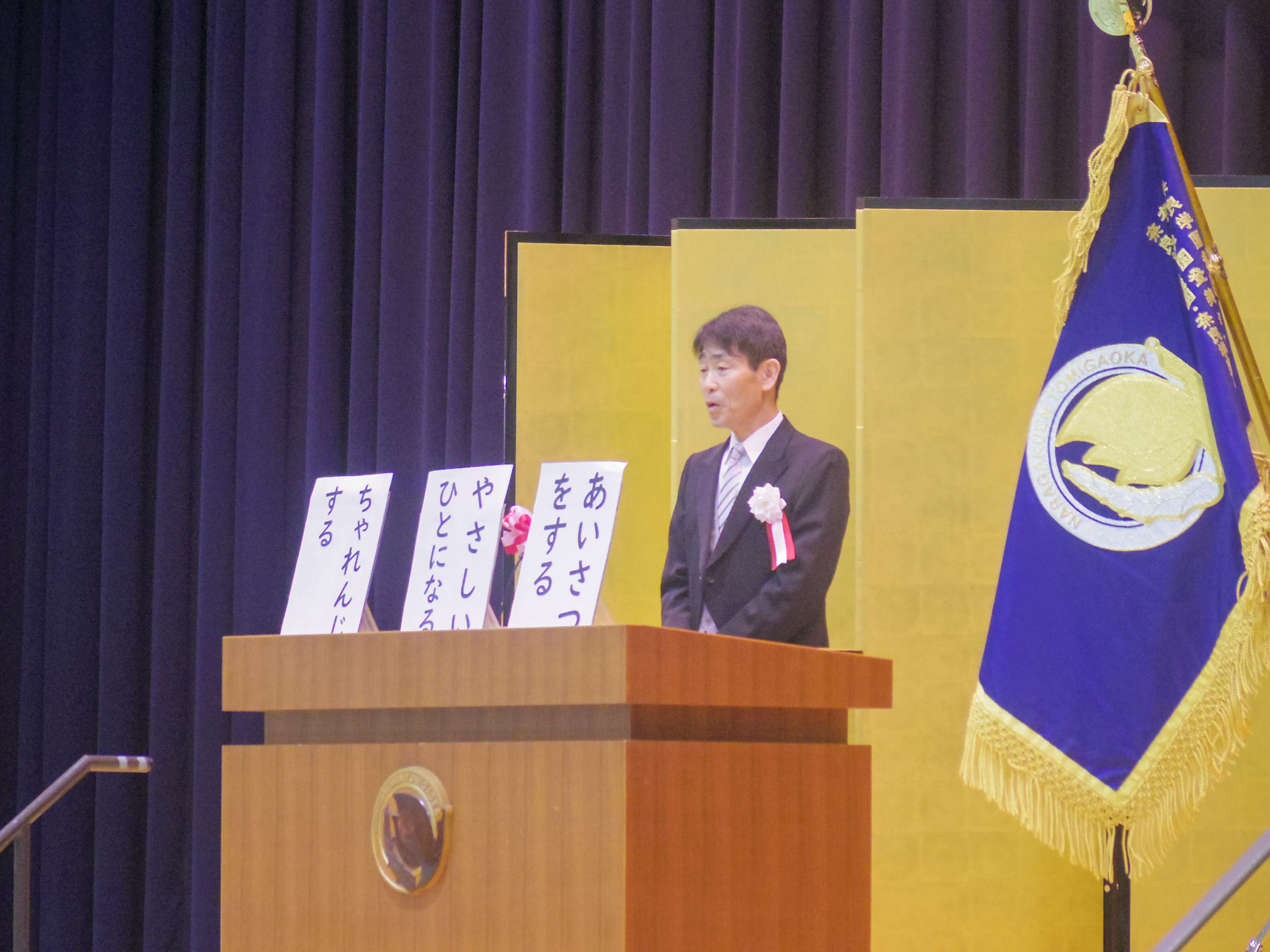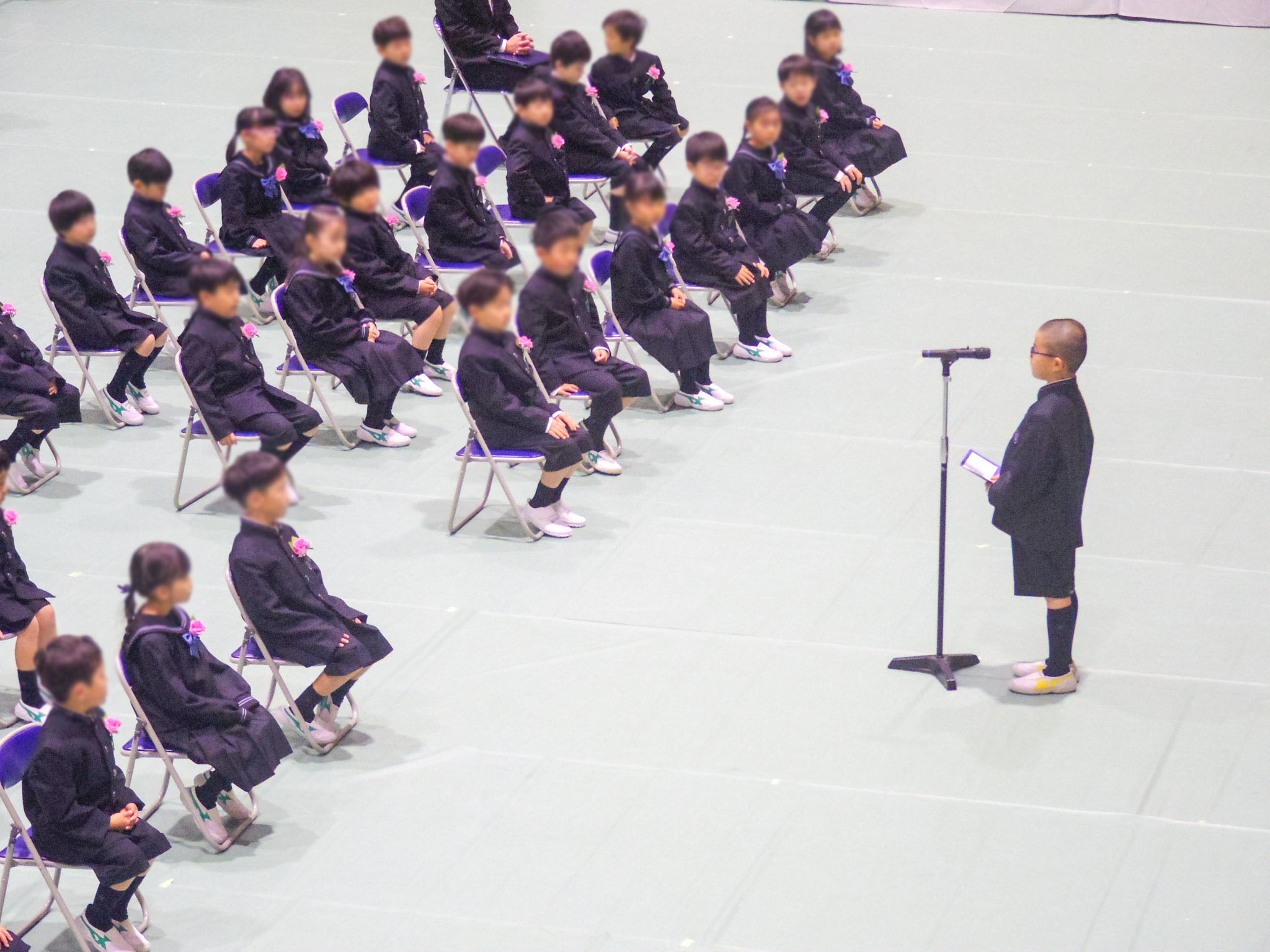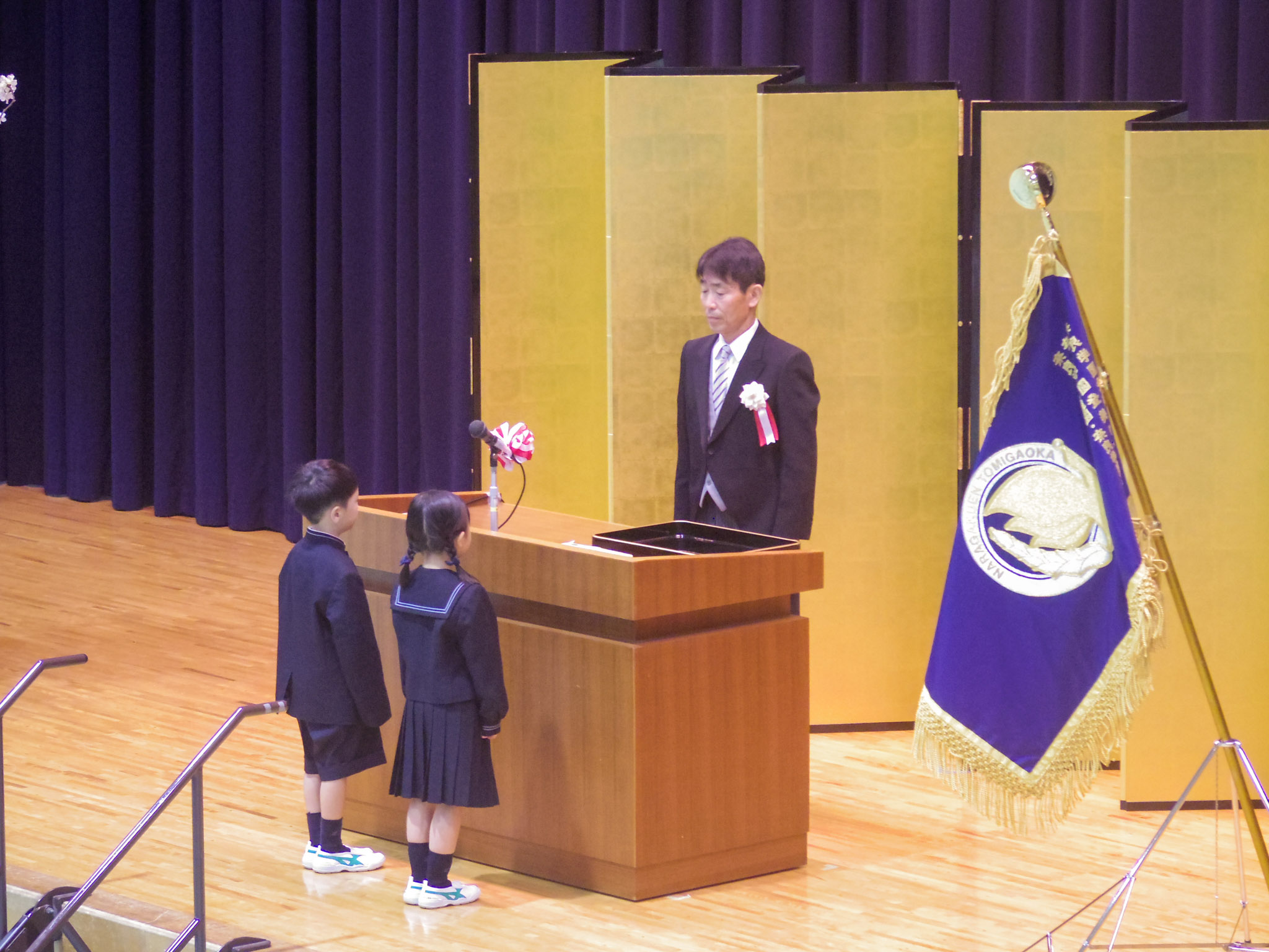 高塚校長は式辞で「校長先生や先生方は皆さんに今日会うことをとても楽しみにしていました」と歓迎し、小学校生活での3つの約束として「あいさつをする」「やさしいひとになる」「チャレンジをする」を挙げました。続いて伊瀨敏史理事長が「今日のワクワクとした気持ちをいつまでも持ち続けてほしい」と新入生を励ましました。