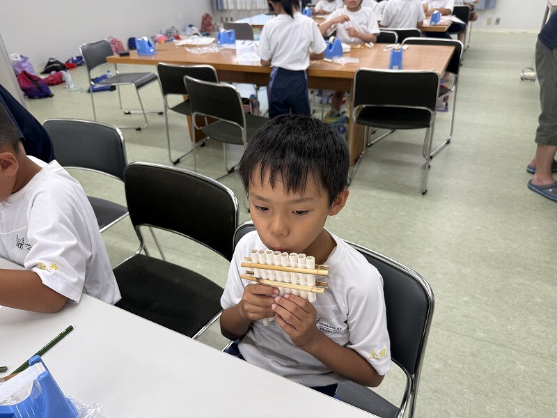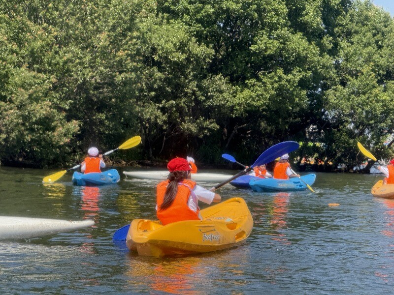 活動では、みんなで力を合わせてドラゴンボートをこいだり、カヌーで水質浄化や生物のすみかになるヨシ帯観察をしたり、そのヨシでできたヨシ紙笛を作ったりしました。また、食事においても、琵琶湖固有種であり、昔から食用にされてきたビワマスを実際に食べるなど、様々な活動を通して、琵琶湖を体感することができました。