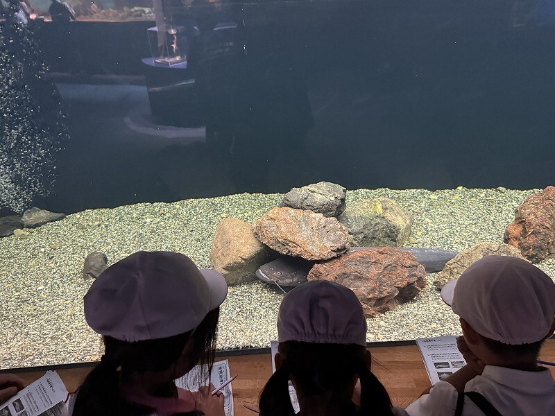 琵琶湖博物館での学習では、学芸員の方から琵琶湖の環境や、琵琶湖版のSDGsであるMLGs(マザーレイクゴールズ)について、丁寧に分かりやすく教えていただきました。子どもたちは、遠いと思っていた琵琶湖が実は自分にもつながっていることを感じたようでした。その後は、実際に博物館の中に行き、グループ活動で展示を見回ったり、クラスで水族展示を見たりと実際に体験することによって、琵琶湖の学習を深めることができました。