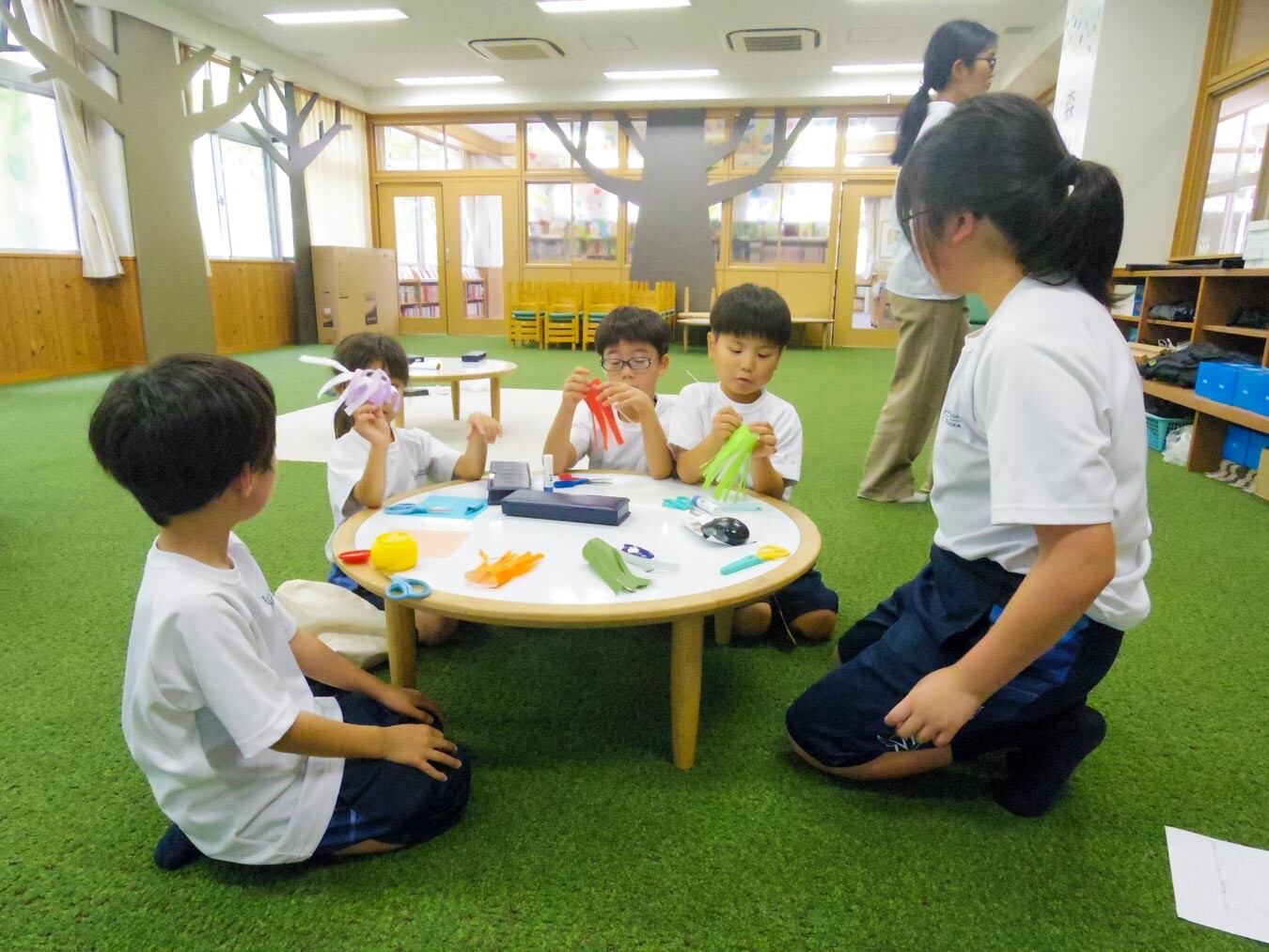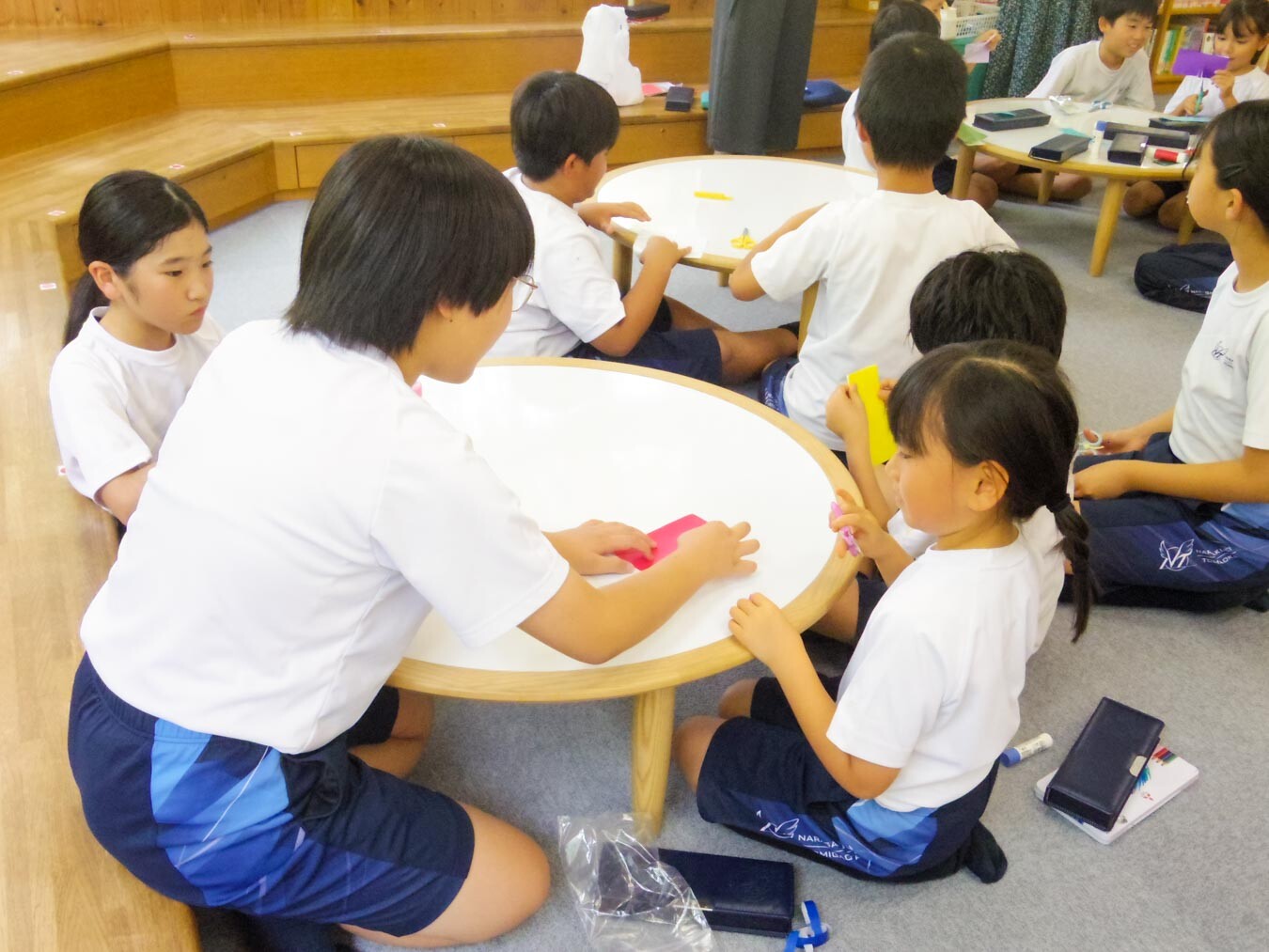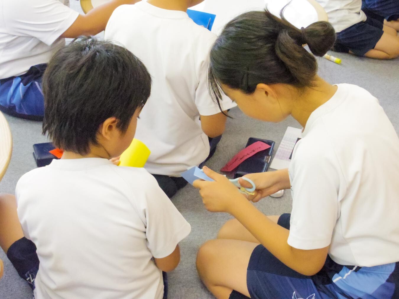 M2(6年)生が中心となり、飾りの作り方を下の学年の子たちにやさしく教える様子があちらこちらで見られました。色とりどりの折り紙を使って、ちょうちんや貝つなぎ、天の川など、子どもたちはそれぞれ好きな飾りを選び、工夫しながら取り組んでいました。「ここを折って、こう切るんだよ」と、上級生は実際に折り紙を折り、切る場所をわかりやすく説明していました。