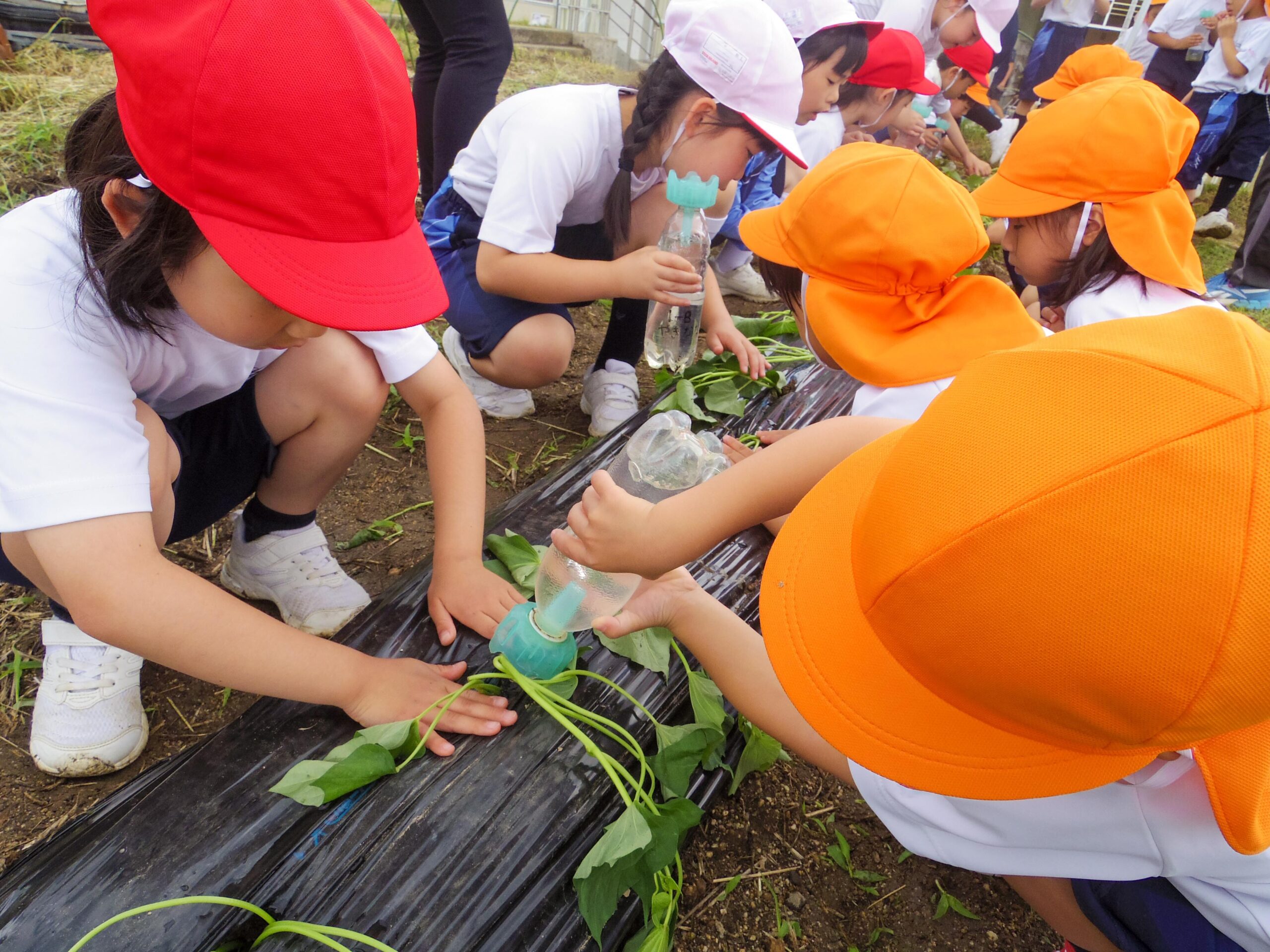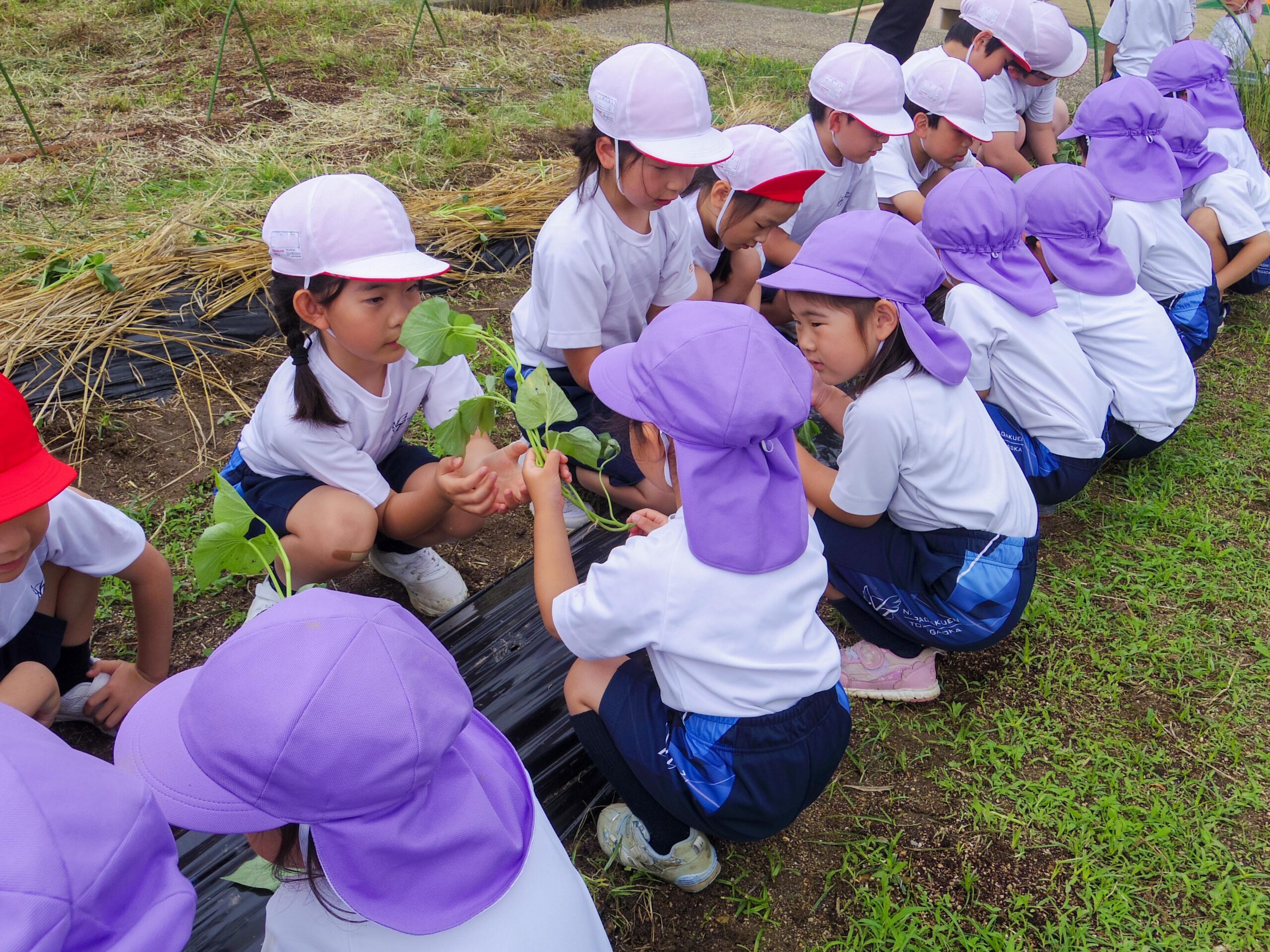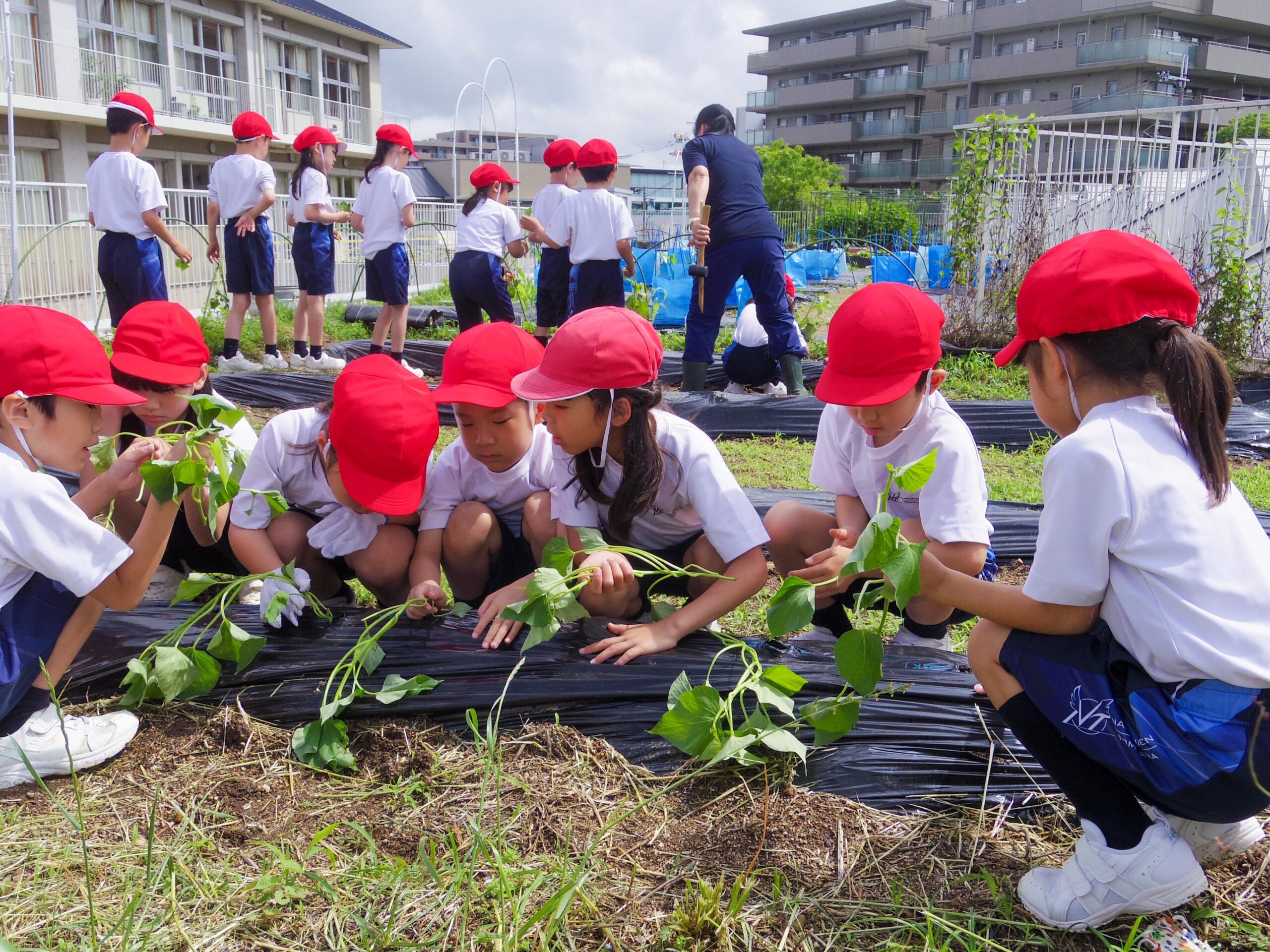 作業を終えた後は向かい合って元気にあいさつを交わし、みんなで集合写真を撮影しました。子どもたちが協力して植えたさつまいもの収穫が今から楽しみです。
