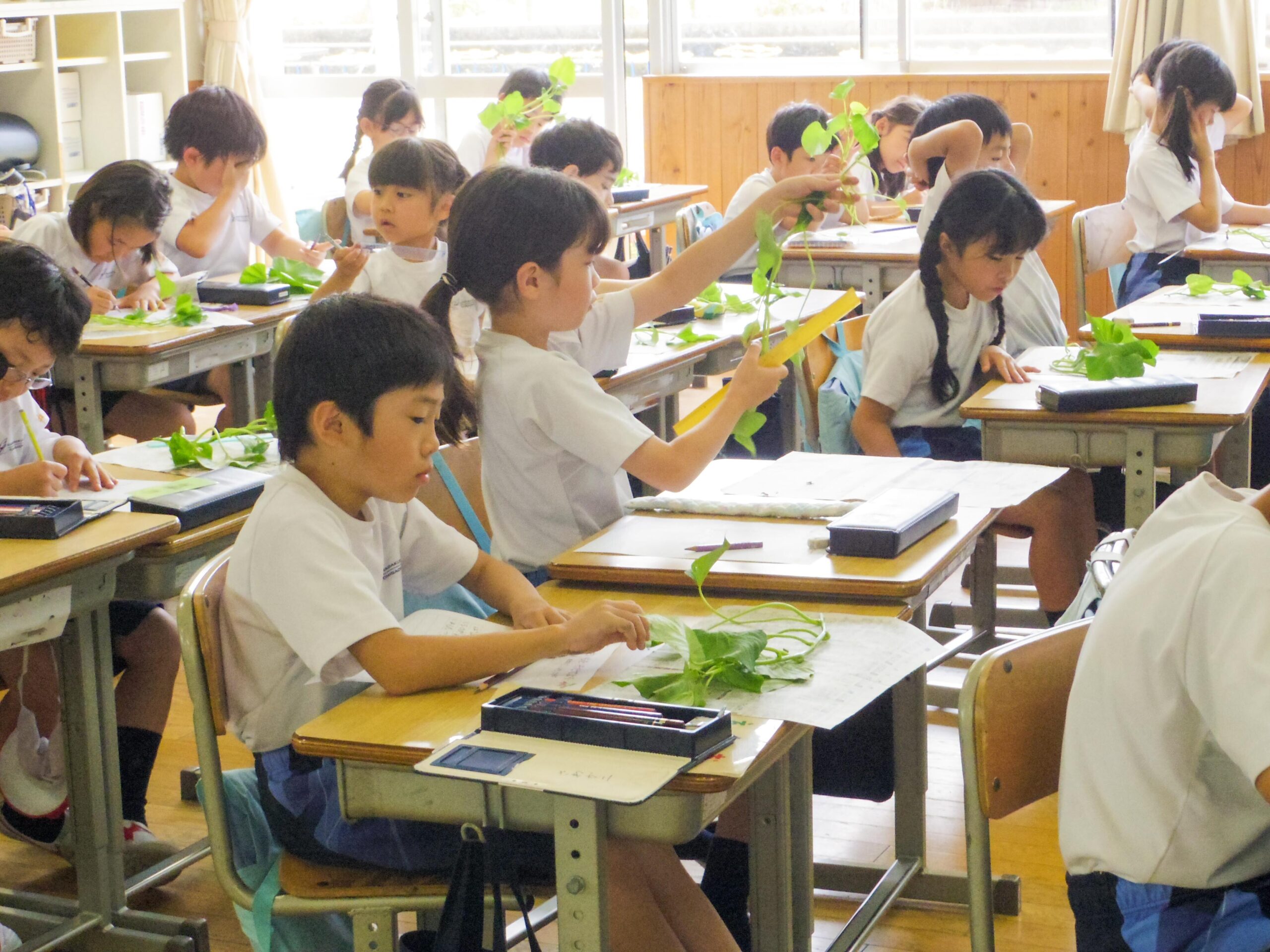 P2(小2)学年が学校敷地内の畑でさつまいもの苗植えを行いました。まずは教室で苗を観察し、「葉っぱの形や色は?」「茎はどうなっている?」など、観察のポイントを話し合いました。また、苗の植え方のコツについても学びました。児童たちは、ものさしで測った葉の長さや裏側の様子をワークシートに記録し、丁寧に絵を描いて感想も書き込みました。観察を終えた後、苗を持って畑へ。一人ひとりが苗を土に植え、たっぷりと水をあげました。