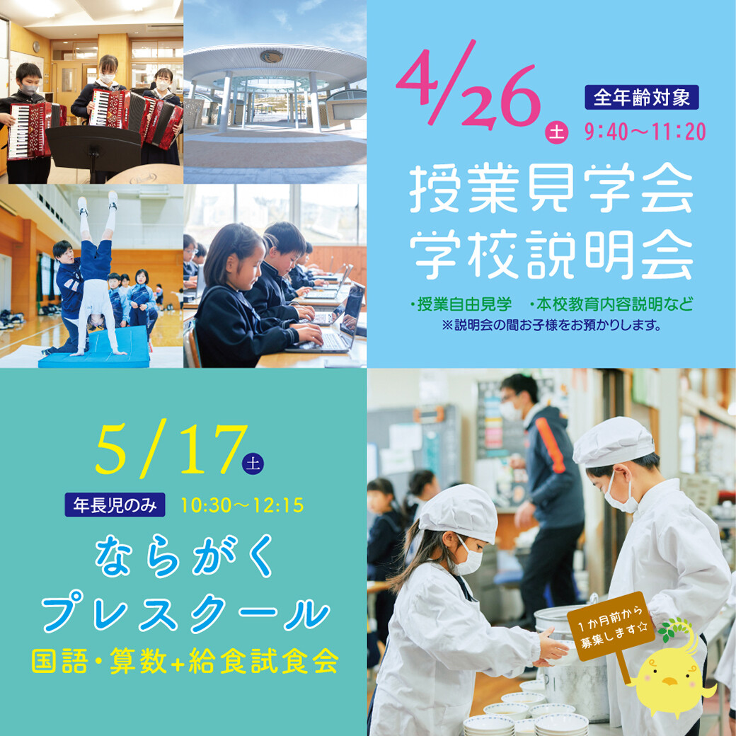 ならがくプレスクール 国語・算数with給食試食会を開催します。