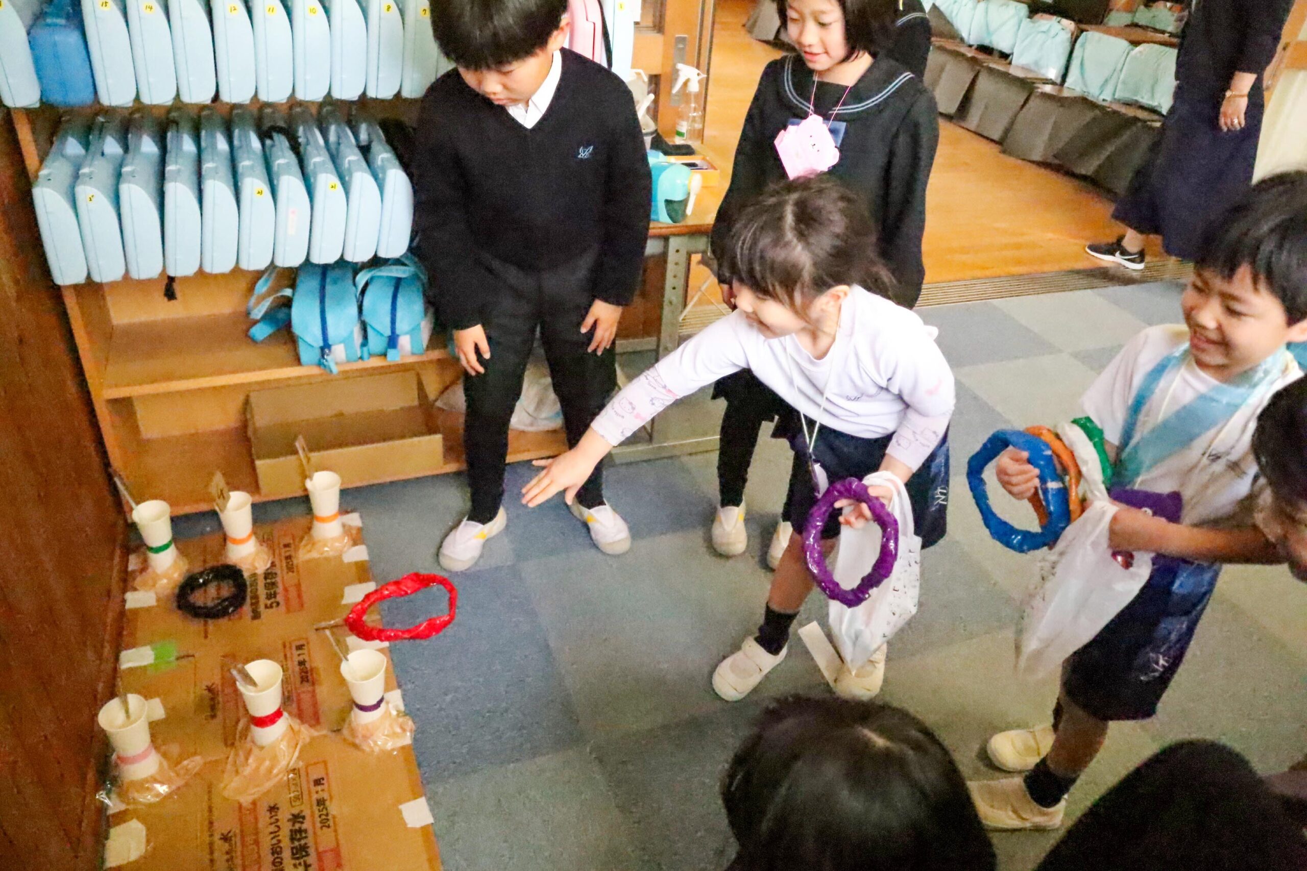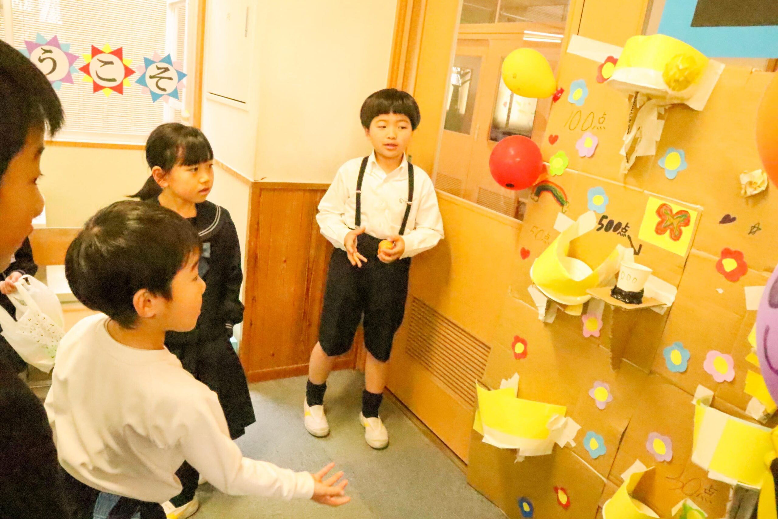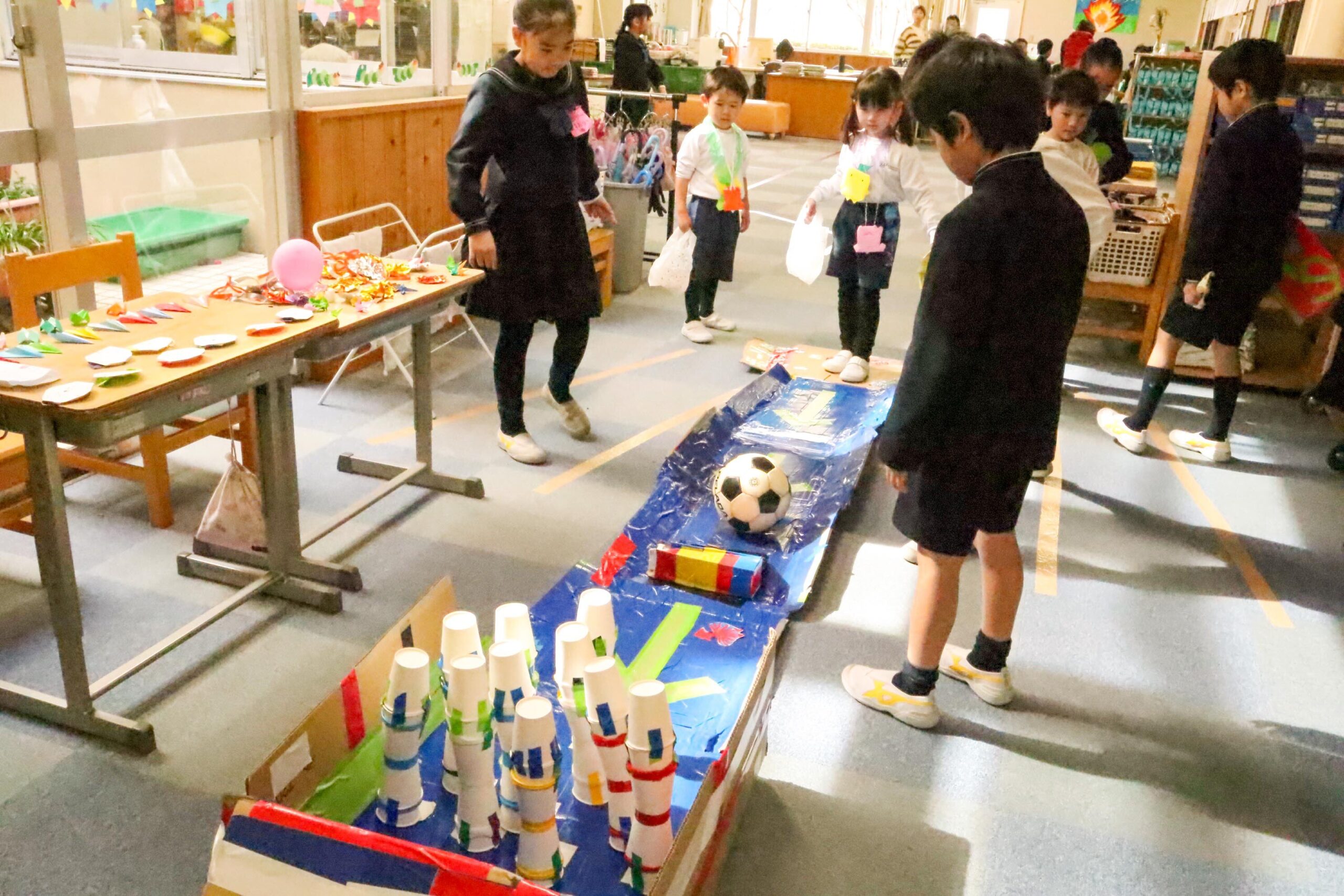 「おもちゃランド」には、ダンボールと紙コップで作ったボーリングや、坂のコースを手作りの自動車が走るレース、玉入れ、輪投げなどが並び、園児たちは夢中で遊んでいました。また、クイズコーナーや折り紙教室なども人気で、お化け屋敷に入った園児からは「ぜんぜん怖くないけど、面白かった」と大人気でした。