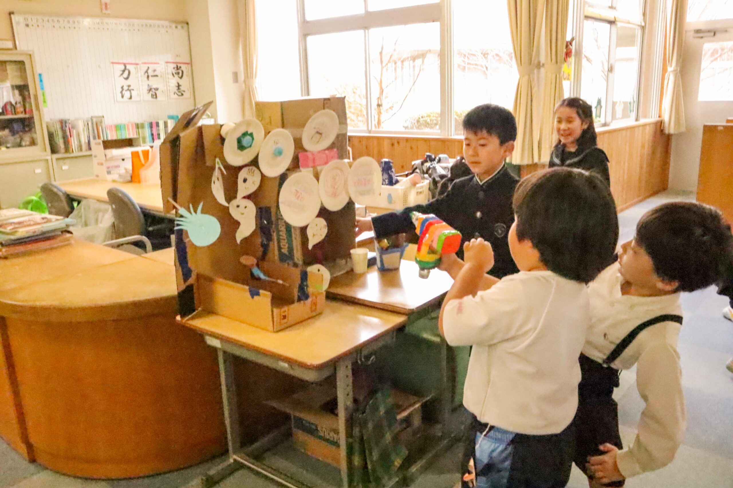 P2(小学2年)生のみんなが「おもちゃ研究所」の研究員となり、楽しい工夫がいっぱい詰まったさまざまな遊び道具を制作しました。