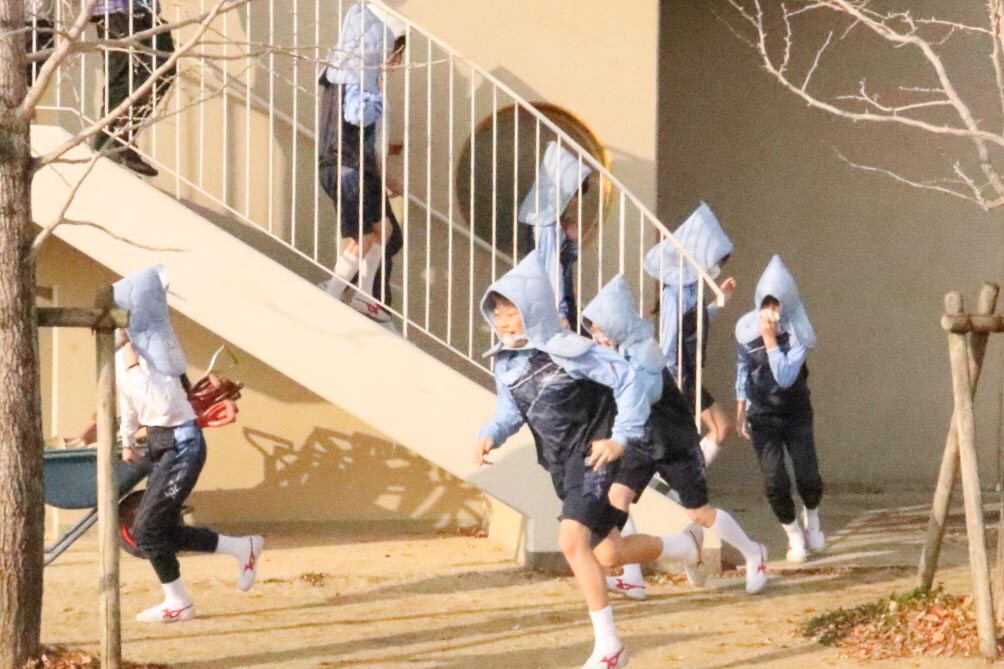 その後、通常の授業が始まった頃にサイレン音が校内に鳴り響き、訓練用の校内放送が流れました。児童たちは急いで自分の机の下に潜り、先生は児童たちと教室内や扉の外の安全状況確認をしました。